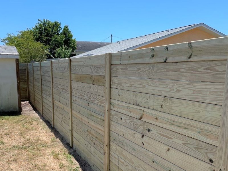 This style is popular for Modern and Coastal Architecture is not only for residential customers, it is also a great choice for commercial properties across Florida. With our standard style horizontal wood fence, the pickets are next to each other, offering semi-privacy with some visibility between pickets. If you prefer style over privacy, or have a beautiful backyard landscaping to boast about, then this is the perfect fence for you. Installing a Horizontal wood fence will expand your backyard. The Horizontal wood fence lines can make your property look even larger visually making any space feel bigger. Horizontal wood fences are perfect for customers who want something a little more unique. Because this type of wood fence is available in countless designs, it's easy to showcase your unique personality. Horizontal wood slats appear sleek and modern, and they can update the look of your property in an instant. Horizontal wood fences are available in different heights, as well as finishing trims. Top trim and side trims can be added for a framed appearance, but can also be left out as a simple design for a more cost-effective project.